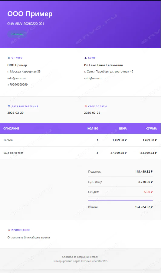 ✅ Генерация счетов в формате HTML