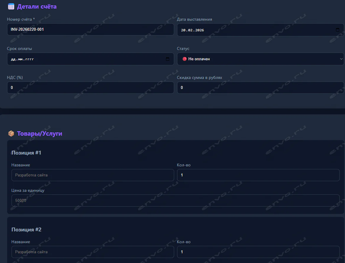 ✅ Добавление товаров/услуг (до 10 позиций)