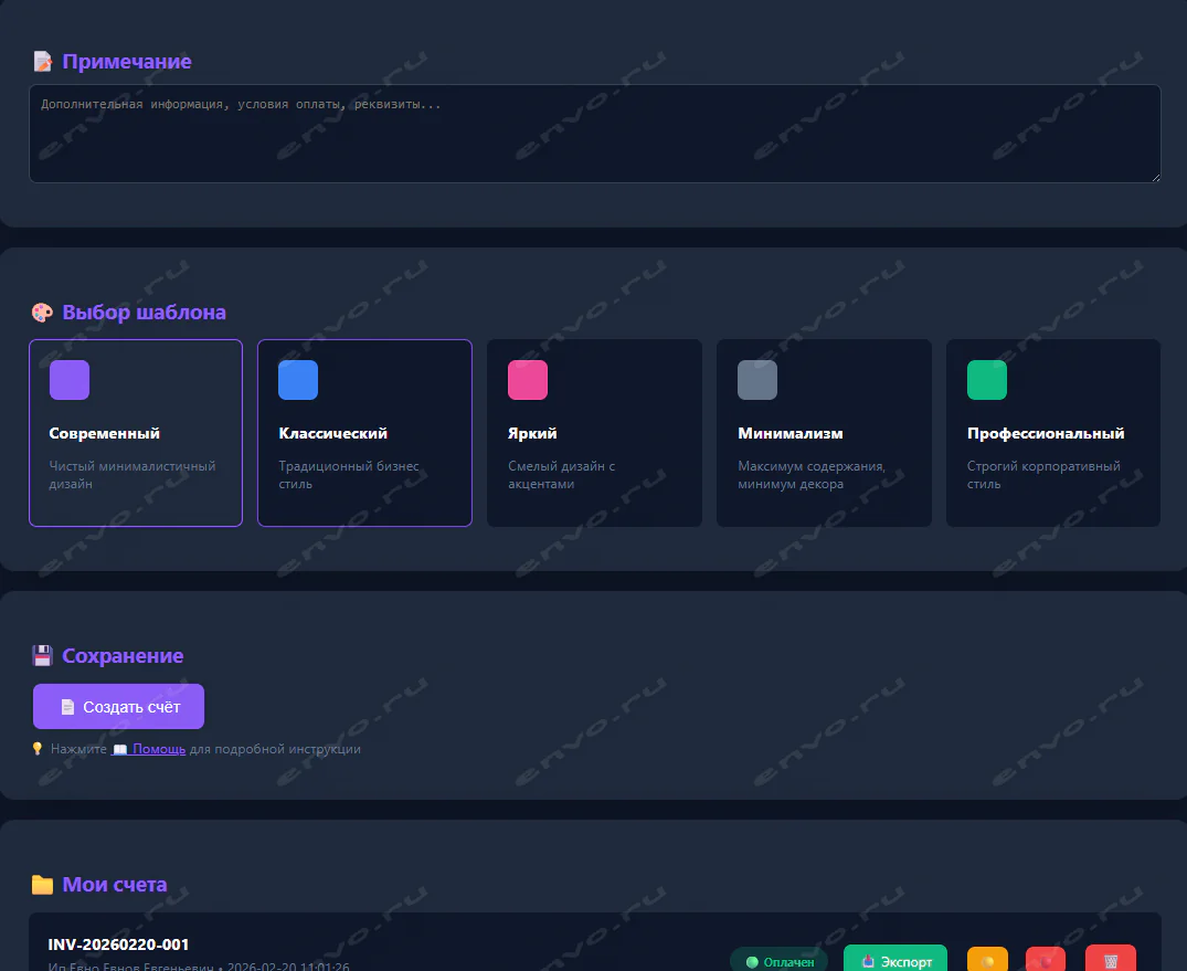 ✅ Генерация счетов в формате HTML