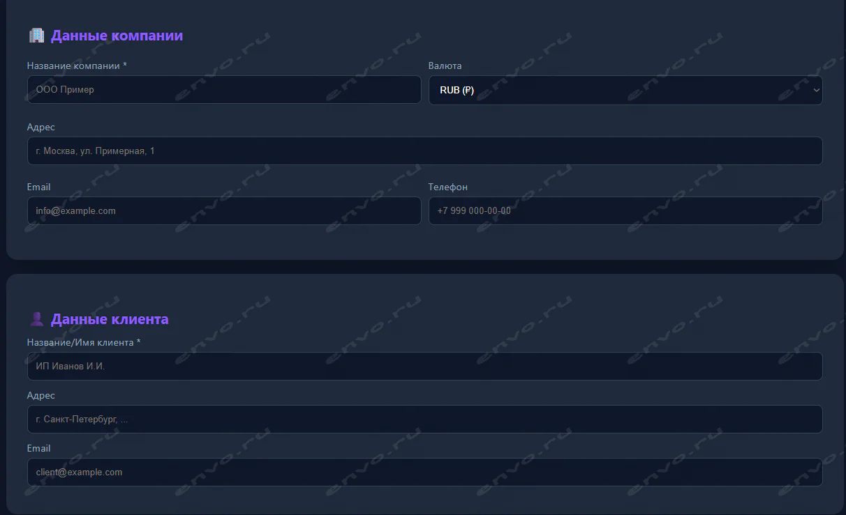 ✓ Заполнение данных компании и клиента