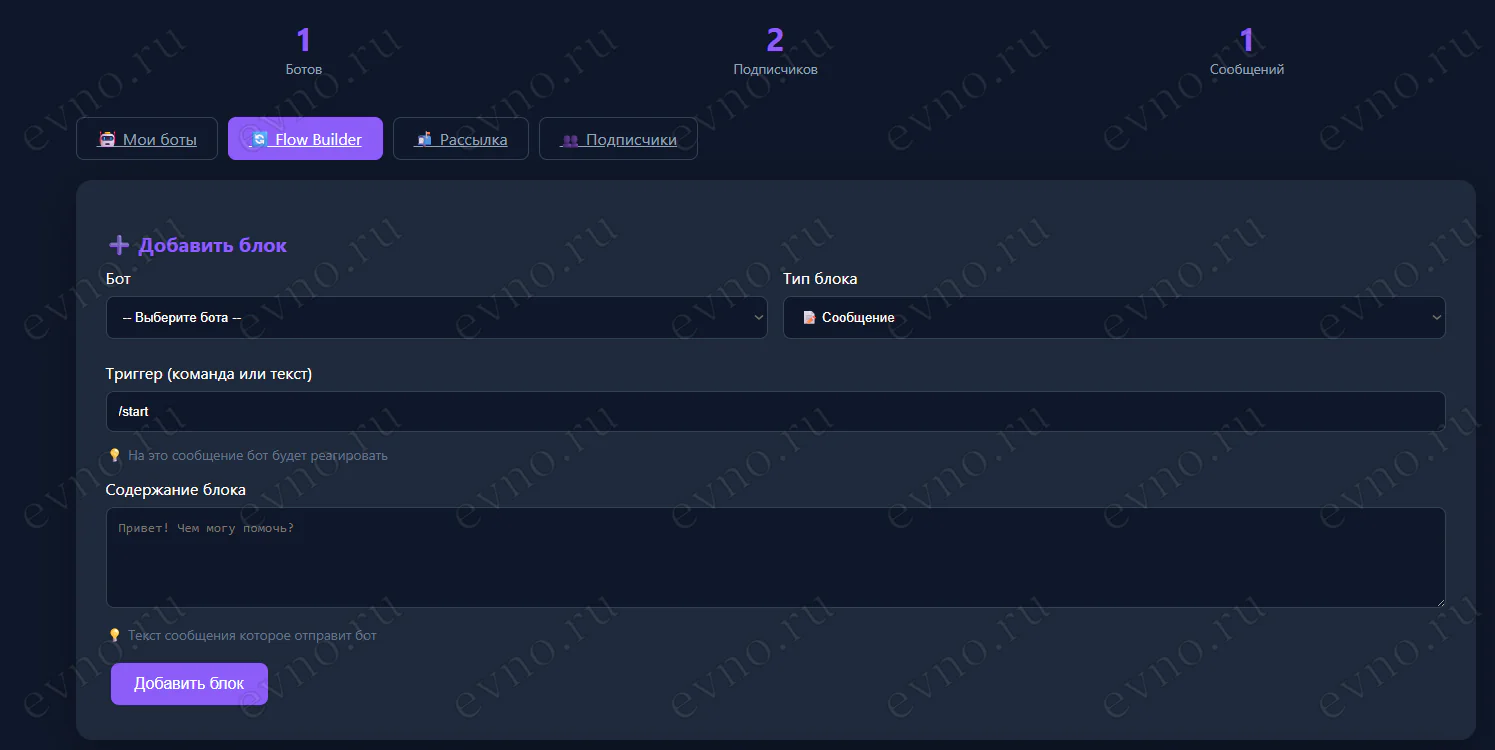 с сценариями, кнопками и рассылками за считанные минуты.